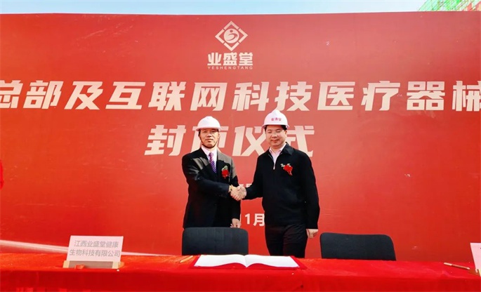 在封頂儀式上,業(yè)盛堂曾水泉董事長(cháng)與南昌易醫研究院及山西澳邇藥業(yè)有限公司簽訂了戰略合作協(xié)議。